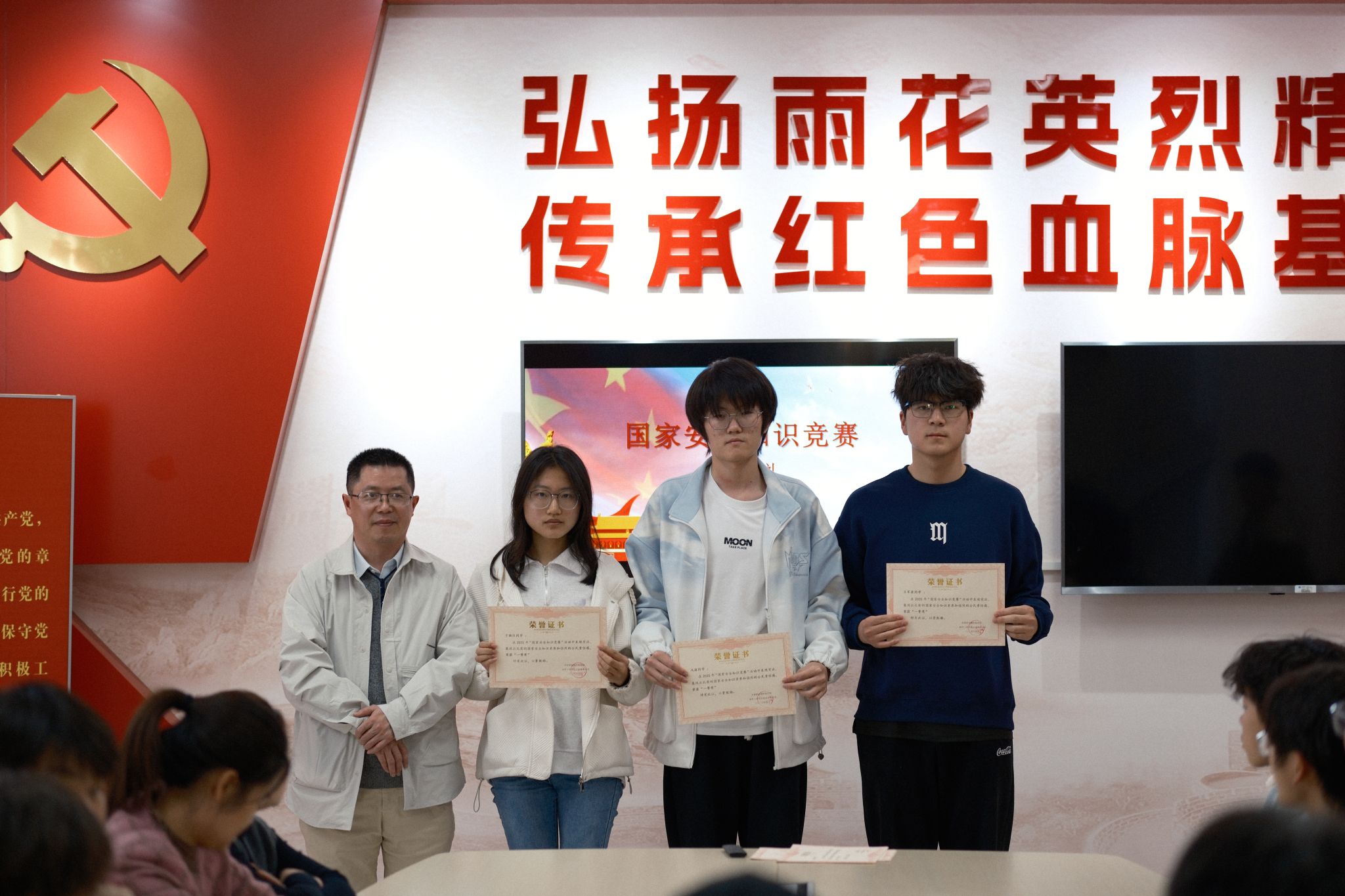 活动伊始,主持人致辞强调,国家安全是安邦定国的基石,当代青年需以“国之大者”的胸怀践行使命担当。经过激烈的角逐,竞赛中有18名学子脱颖而出。主持人指出,竞赛既是知识技能的比拼,更是一堂生动的国家安全教育实践。 颁奖环节中,党委副书记徐斌、辅导员杜文娟、邵彦婷依次为获奖学生颁发证书及奖品。本次竞赛评选出一等奖3名、二等奖6名、三等奖9名。现场掌声雷动,荣誉证书映衬着学子们踌躇满志的面庞,展现出青年一代的责任担当。徐斌书记在总结讲话中指出,当前国家安全面临多元复杂挑战,青年学生要深刻领会三点要求:一是强化政治自觉,始终将维护政治安全放在首位;二是增强忧患意识,警惕意识形态渗透、生物安全危机等风险;三是扛起时代责任,坚决抵制危害国家安全的行为。仪式尾声,主持人向全体与会师生及工作人员致谢,并号召大家以此次活动为契机,将国家安全意识内化于心、外化于行,争做国家安全的守护者。为构建“人人有责,人人尽责“的国家安全共同体贡献力量。