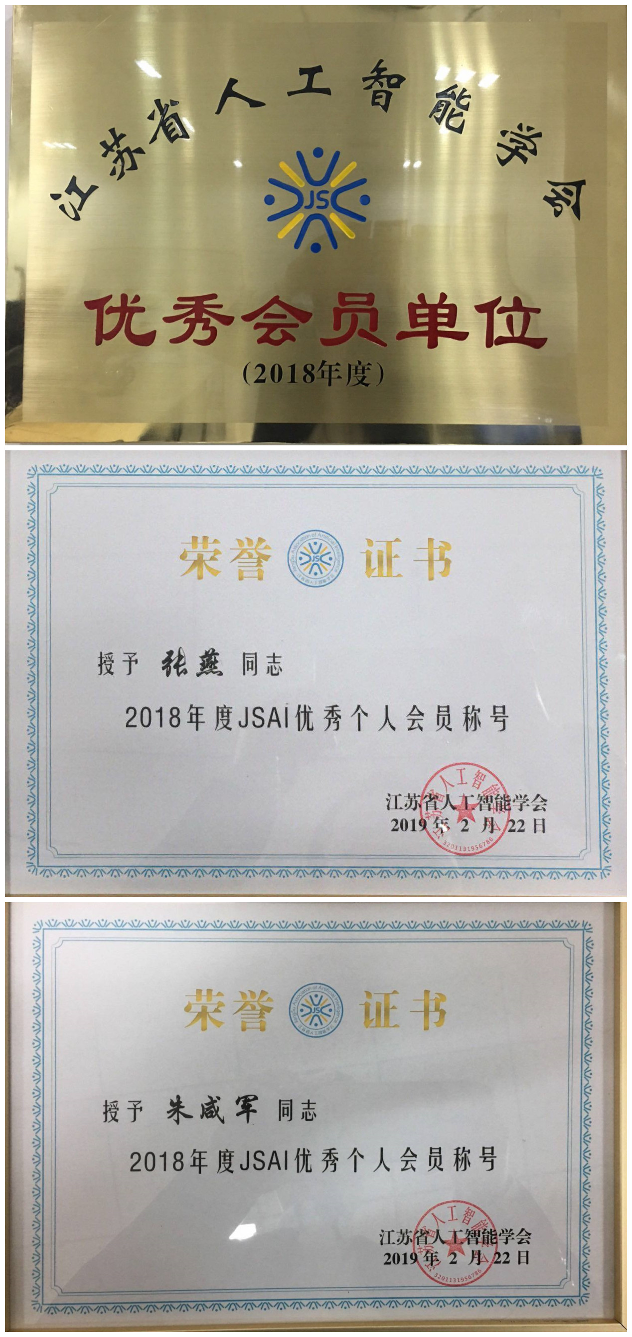 江苏省人工智能学会在《关于2018年度先进集体和个人的决定(苏智会【2018】9号)》中决定授予AWC万象城娱乐为江苏省人工智能学会优秀会员单位(2018年度),授予张燕副校长和朱咸军博士为2018年度JSAI优秀个人会员称号,并授予2017级陈亭谕同学和郭孝斌同学为2018年度JSAI优秀志愿者称号。