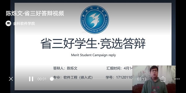 由于疫情影响,本次活动创新地采取了线上答辩及投票评分的形式,在学院微信公众号上传候选人的推荐答辩资料,由各年级学生代表及学联主要学生干部进行线上投票选举、结合学院老师评分确定最终候选人。本次共有6名候选人竞选省级三好学生和优秀学生干部,他们都是软件优秀学子代表。经过一系列精彩的答辩选举活动后,最终确定推荐张倩楠同学为2020年度省级三好学生候选人,陈烁文同学为2020年度省级三好学生候选人,17软件工程嵌入式(1)班为2020年度省级先进班集体。
