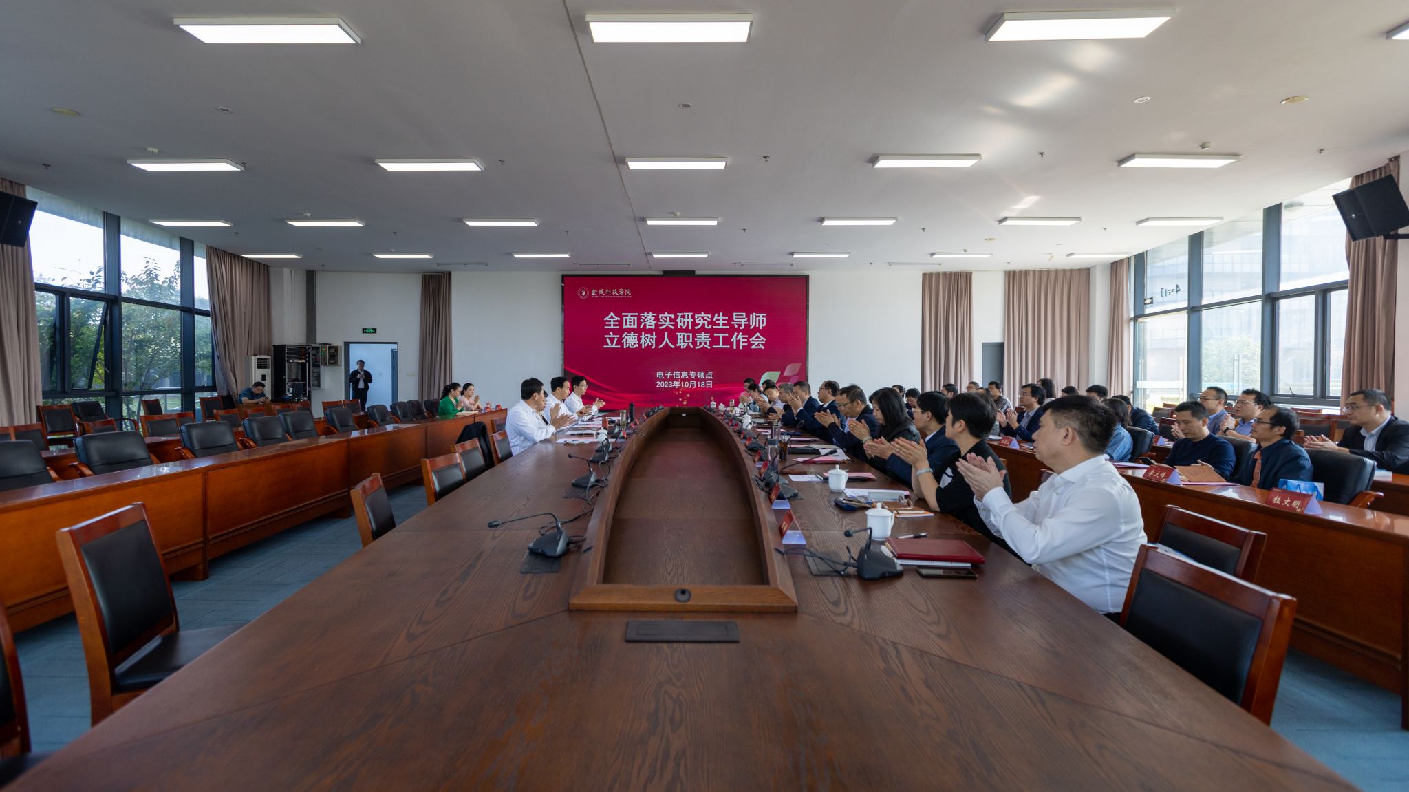 会上,电子信息专硕点牵头学院院长曾岳教授从招生、师生双选、注册报到等三个方面对电子信息专硕点工作进行了汇报,接着曾岳教授从指导思想、总体要求、研究生导师立德树人职责以及研究生导师立德树人考核机制等四个方面对《电子信息专硕点全面落实研究生导师立德树人职责的实施细则》进行了宣讲和解读。交流阶段,研究生导师代表吴有龙副教授发言,就个人履行研究生导师立德树人职责提出了自己的见解和思考。牵头学院党委书记徐志国从加强研究生导师思想政治建设,完善研究生导师的管理体制,健全研究生管理和评价机制三个方面对全面落实研究生导师立德树人职责提出了要求。