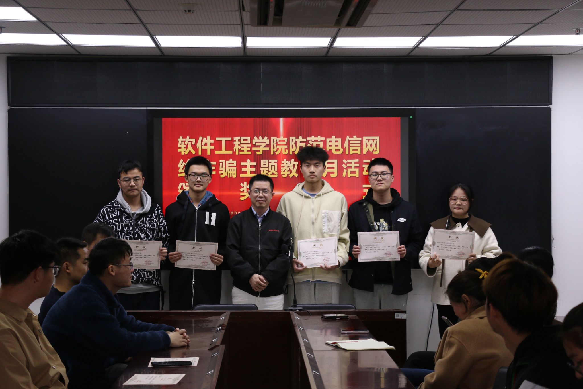 为进一步提高我院师生防范电信网络诈骗意识和自我保护能力,坚决遏制电信网络诈骗犯罪,保障师生们的财产安全和人身安全,软件学院开展了以“筑牢反诈防线 共建和谐校园”为主题的防范电信网络诈骗主题宣传教育月活动。3月29日,软件学院在科技楼2-423会议室举办“防范电信网络诈骗主题宣传教育月”颁奖仪式,软件学院党委副书记徐斌、全体辅导员、获奖代表及各班安全员参加了本次活动。