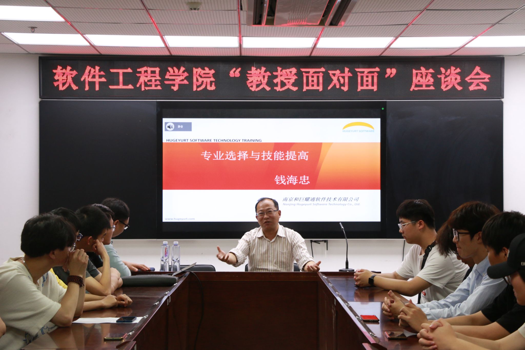 本次座谈会邀请到了南京和巨耀通软件技术有限公司技术部总经理钱海忠博士,他从企业定位及公司在智慧城市信息化建设领域、数据治理产品等应用软件产品与开发、技术服务等业务方面做了详细介绍;通用软件开发工程师的岗位职责、岗位要求;Java后端工程师具备的技能栈等内容。并表示希望以此次交流为契机,与学院在人才培养、学生实习、产教融合等方面进行深度的合作。最后他建议参会学生确定一个实际项目作为综合练习与实践目标,尽早提升个人求职竞争力。