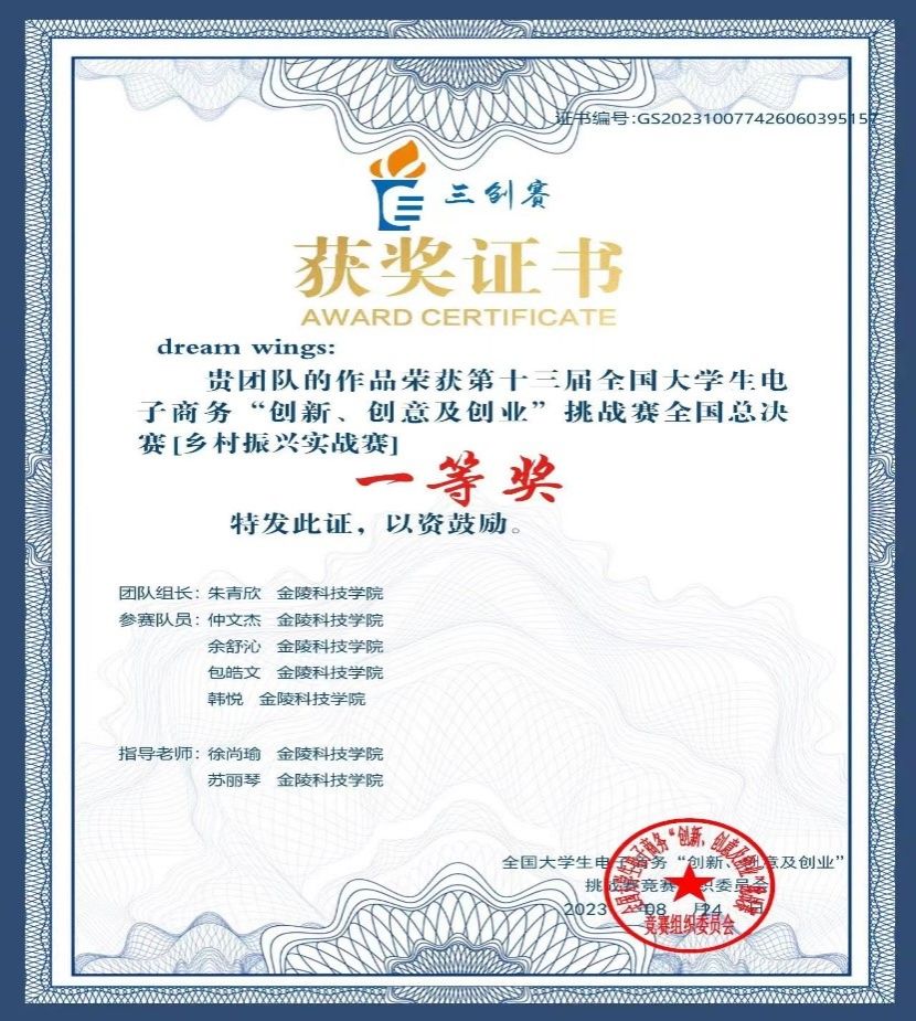2023年3月,dream wings团队参加校内选拔赛,成功晋级路演答辩环节,最终获得“校赛一等奖”和“最佳创业奖”。6月,dream wings团队代表AWC官网在南京邮电大学参加江苏省省赛,成功斩获省赛一等奖。之后,dream wings团队不断打磨PPT与演讲稿,最终在7月dream wings团队代表学校参加全国总决赛,荣获全国一等奖。
