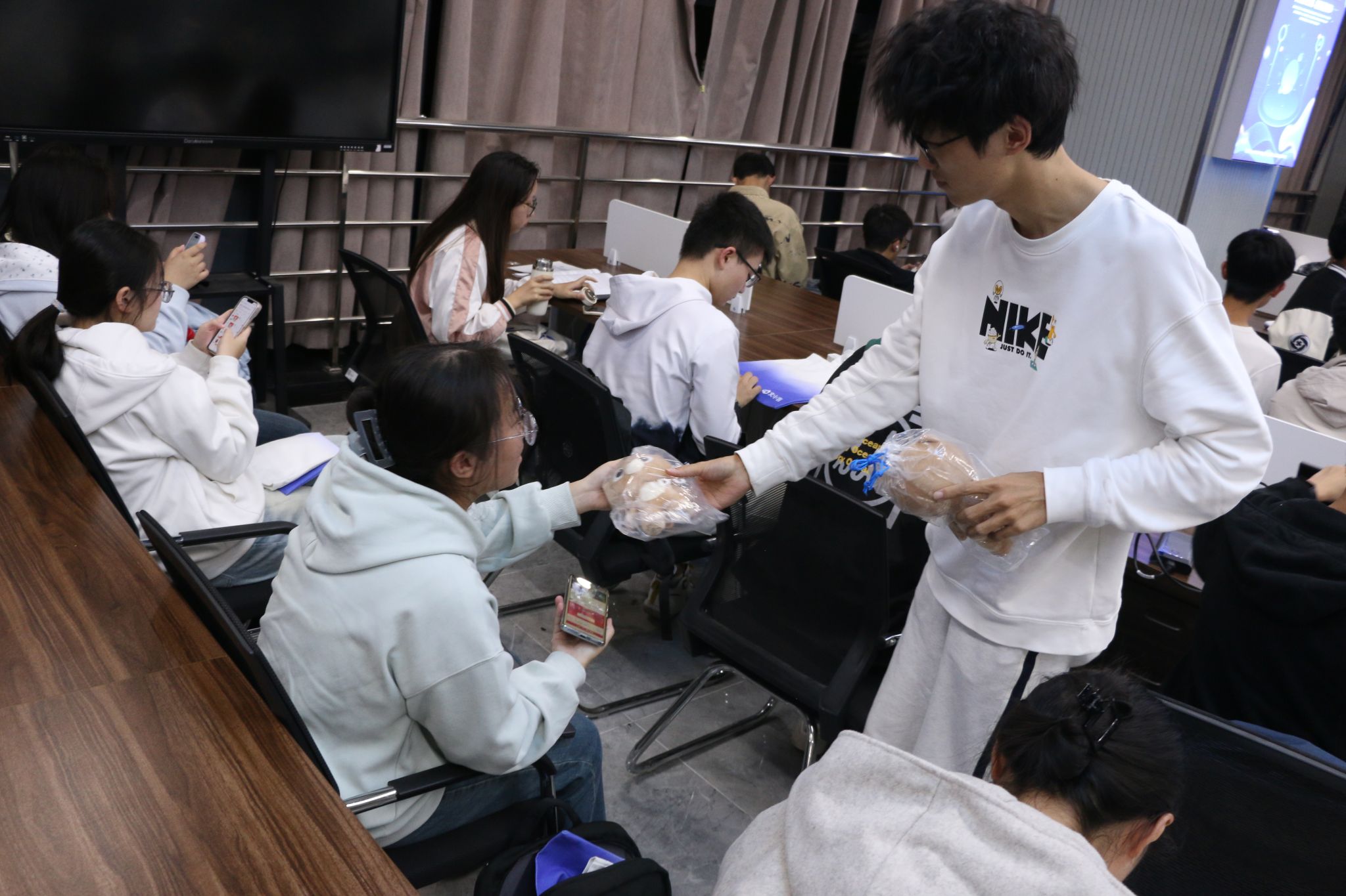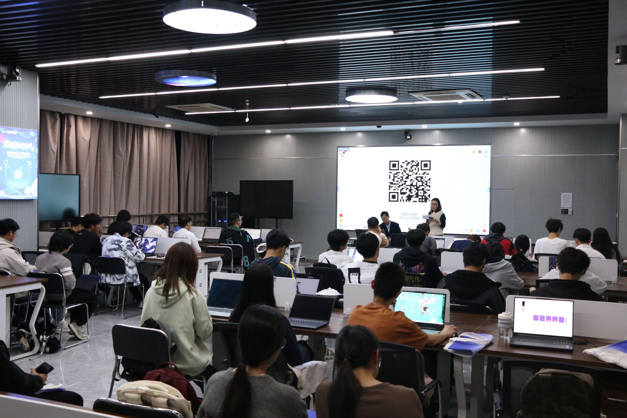 讲座中,王华老师介绍了人工智能的发展历经五个历史阶段。从最初的萌芽期,到专家系统的兴起,再到神经网络的发展、深度学习的突破以及如今生成式 AI 的蓬勃发展,每一个阶段都为人工智能的进步奠定了坚实的基础,并进一步指出人工智能技术在医疗、交通和金融三个典型场景中发挥着重要作用。在医疗领域,人工智能助力疾病诊断和治疗,提高医疗效率和准确性;在金融领域,它为风险评估和投资决策提供有力支持;在交通领域,人工智能实现智能交通管理,提升出行的安全性和便捷性。同时也强调了生成式AI百度飞桨和文心大模型在人工智能领域表现突出。讲座最后王华老师提出人工智能与生成式 AI 的产业实践正在不断拓展,并将继续引领产业创新,为经济社会的发展带来更多的机遇和挑战。董如蝉老师现场还组织同学们进行了有关AI的问答活动以及抽奖活动,提升了现场同学们的参与度和互动性。