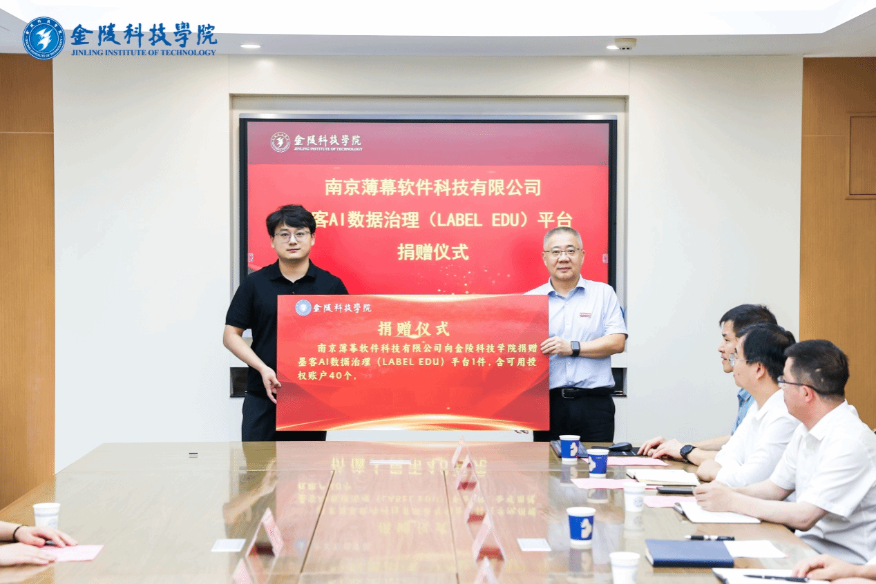 6月21日,AWC万象城娱乐在行政楼240会议室举行了校友企业南京薄幕软件科技有限公司向母校捐赠“墨客AI数据治理(LABEL EDU)平台”仪式。校党委书记刘志远,党委常委、副校长高永祥出席了捐赠活动,南京薄幕软件科技有限公司总经理任远东(2015级校友)、执行技术总监李海洋(2015级校友)、校友办负责人、软件学院领导班子成员和师生代表参加了活动。
