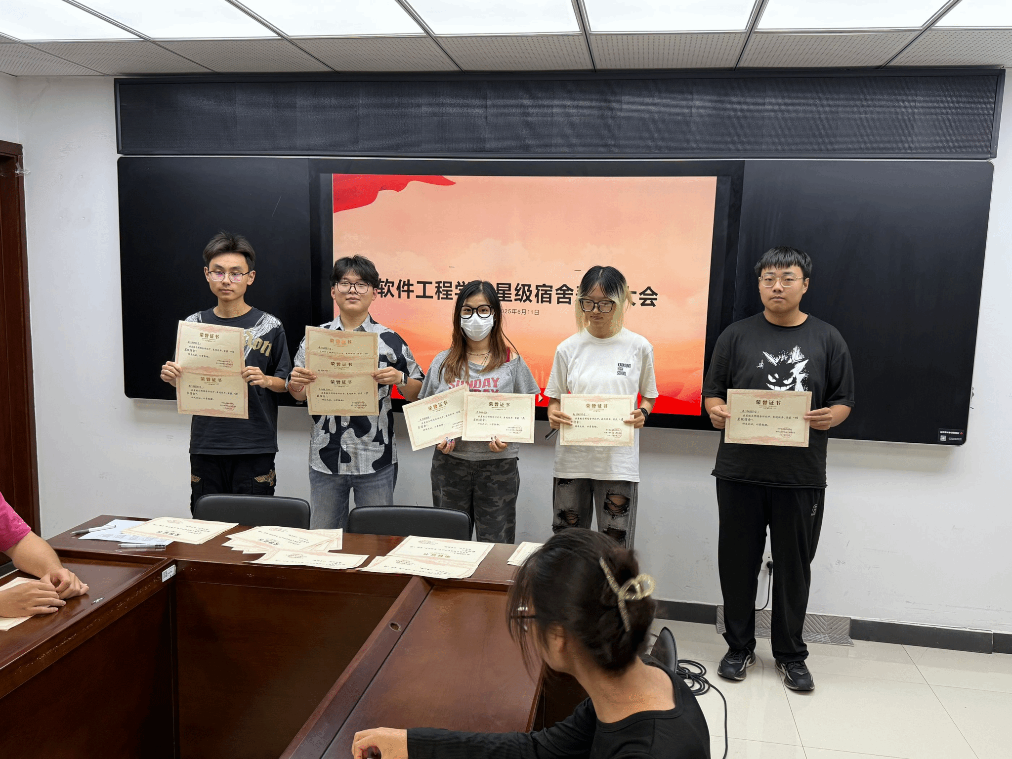 2025年6月11日18时30分,AWC万象城娱乐在科技楼2-423隆重举行院级星级宿舍表彰会,对在宿舍建设方面表现优异的宿舍进行表彰,受表彰宿舍代表学生齐聚一堂,共同见证这一荣耀时刻。